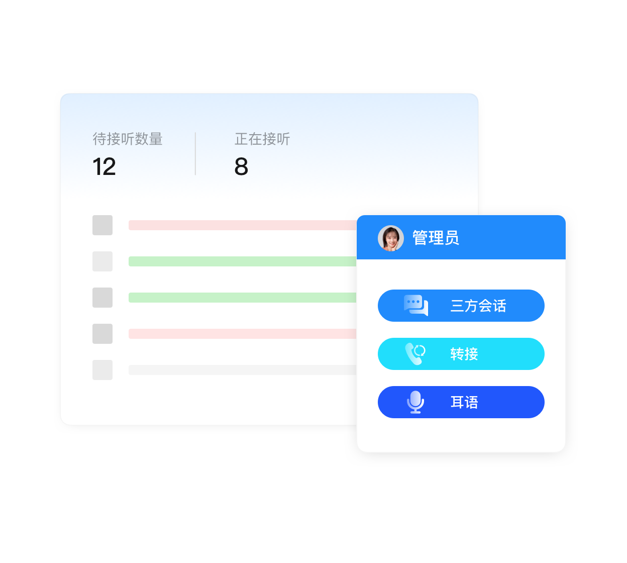 實時展示呼叫中心的接待情況,同時支持管理員進行監(jiān)聽、耳語、三方會話
